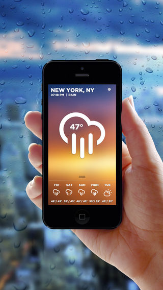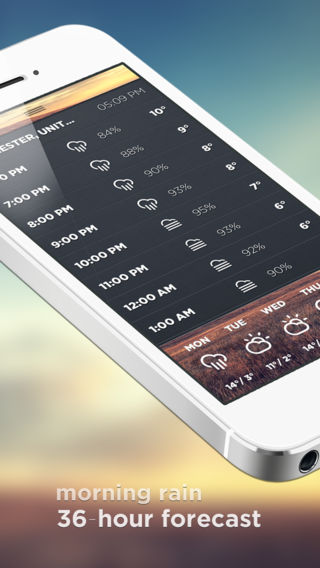 App Descripton: The very popular Morning Rain - An absolutely gorgeous, simple, highly accurate and reliable weather app, that has topped the weather categories in 28 countries! Features Include: • Current weather conditions and forecasts and local time for your current location and/or any other locations all over the world. • Extremely accurate weather forecasts powered by the Weather Underground API. • Swipe up to reveal 36-hour weather forecast! • Percentage of Humidity. This is reflected in the hourly forecast to the left of the temperature. • Alerts to warn you about severe weather in your current area. • The option to switch between Fahrenheit and Celsius. • 5-day forecast including high/low temperatures. • Easy navigation between locations. Swipe either to the right or left to switch between locations. To delete a location the settings panel, swipe from right to left on the location itself! • Extraordinarily beautiful backgrounds. • An intuitive interface featuring slick, subtle animations. Connect: http://www.morningrainapp.com twitter.com/morningrainapp Special design credit to Adam Whitcroft for the awesome Climacons.