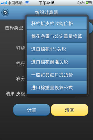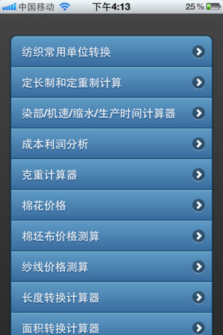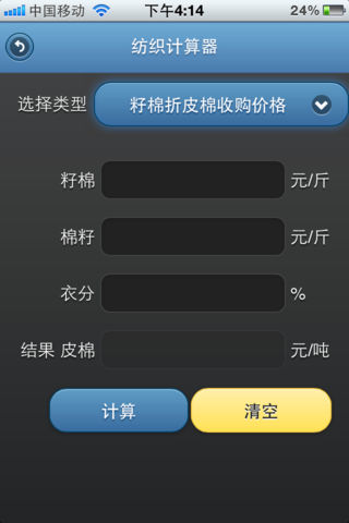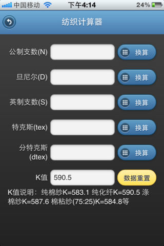 纺织计算器由国内领先的纺织行业电子商务服务专家——中国绸都网开发出品,是专为纺织从业者提供的行业计算器应用。包含各种纺织常用单位换算、染部/机速/缩水/生产时间计算、成本利润分析计算、克重计算、棉坯布价格测算、纱线价格计算、定长制和定重制计算、进口燃油成本计算,以及其他长度、面积、温度、金价计算等。