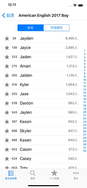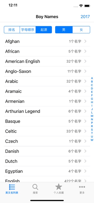 免费好用的英文名大全!数据来自美国权威机构最新统计,为您收集全美最受欢迎的新生儿名字。 本App默认提供2000个最受欢迎的男女名字,并附有丰富的英文原版解释;读音,名字来源,涵义以及最新排名等数据一应俱全。男女通用的名字也有明确注释。 升级到全功能版可以查看过去40年的全部排名数据,共5万多个名字。 同时还有收藏功能,您可以随时一键收藏中意的名字以供以后查看。也可以将名字列表通过邮件发送给自己或者朋友。 主要功能: * 男生及女生名字列表 * 可按受欢迎程度或者字母顺序查看 * 收藏夹及邮件功能 * 丰富解释:读音,名字来源,涵义以及最新排名及出生数据