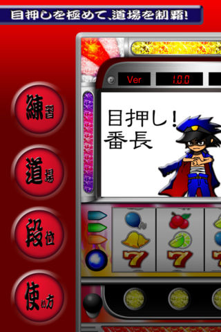 ★★★ 発売記念半額セール! 今だけ50%OFFの170円! ★★★ 目押し!番長で目押し力を鍛え、目指せ月収30万! これだけあれば、目押しのトレーニングはパーフェクト! 実機同等スピードで回転するリールで目押しのコツをつかんでください。 目押し道場で、目押し裏番まで極めればどんな機種でもビタ押し可能。 もちろんパチスロ初心者にもやさしい様々なモードを用意しています。 筐体のフタを開けて、リールを見ながら目押し練習。 リールの絵柄を薄くして実機よりもむずかしい状態で練習。 押した位置を確認できる目押し確認機能付き。 ホールに行く前や、ちょっとした空き時間に遊んでみてください。