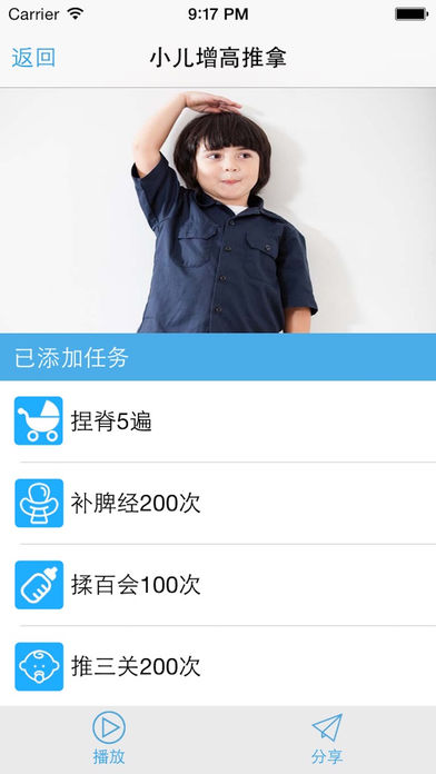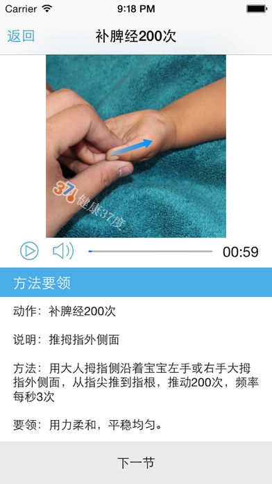 宝宝身体娇嫩,容易生病,但又不想给宝宝吃药打针,怎么办? 快来试试纯自然的小儿推拿方法吧,这是大量中医养生名家的经验总结哦! 这个推拿大全包括:小儿夜啼、遗尿、强体、增高、止咳、退热、开胃、便干、腹泻等12种小儿常见症状。你绝对值得拥有! ======== 健康37度团队(http://jk37du.com)是专注移动健康应用开发的团队,希望我们的努力能“让健康更健康!” 在App Store搜索“健康37度”,您将得到我们的系列健康产品! 联系我们: 网址:http://jk37du.com 邮箱:jk37du@gmail.com 微博:http://weibo.com/jk37du ======== 【小儿推拿作用】 小儿推拿是以中医基础理论为指导,以推拿手法为主要手段以预防儿科疾病及其和保健为目的的方法称之为小儿按摩法属中医外治法的范畴。它无毒副作用、无痛苦、效果好、费用低。对新生的 疾病、小儿内、外、伤科、神经科及局部感染等疾病均可采用按摩手法治疗。 小儿推拿适应对象:出生至十四周岁以下的儿童。 小儿推拿主要以下疾病: 呼吸系统:感冒咳嗽、发烧、支气管炎、肺炎、哮喘、鼻炎、鼻窦炎、鼻出血、扁桃体炎、慢性支气管炎、慢性扁桃体炎等。 消化系统:疳积(积滞、奶痨、奶积、食积)、肠炎、舌炎、吐奶、溢乳、打嗝、鹅口疮、口腔炎、厌食、呕吐、腹泻、便泌、肠痉挛、流涎(流口水)、腹痛、腹胀等。 其它类:磨牙、遗尿、尿频、夜惊、惊吓、斜颈、脑瘫、面瘫、多动综合症、哭闹、疝气、脐疝、湿疹、荨麻疹、风疹、脊柱侧弯、生长发育迟缓、睡眠不好等。 保健类:益智、助长、增强免疫功能。