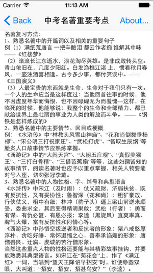 *****中学生语文复习的好应用 给力推荐《初中语文基础知识/作文/中考知识点大全》***** -----内容全面,十分适合中学生及教师使用。 -----本应进行了中考语文复习资料的各个方面汇总,包括: 初中语文基础知识 1.基本文体知识识记 2.名篇名段名句识记 3.语文综合性学习 4.名著百题训练 5.文言文阅读 6.重要文言语段翻译 7.新题型及现代文阅读 初中作文写作技巧大全 8.常用作文写作法详解 9.作文六要 10.中考作文应试策略 中考知识点大全 11.中考必背古诗词 12.中考名著重要考点 13.中考现代文复习资料大全 14.中考熟语及成语 15.误用频率较高的成语
