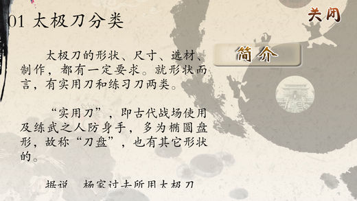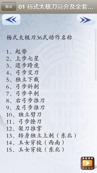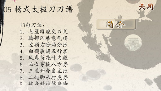 杨式太极刀,又称太极十三刀,吸取了我国古代单刀劈、砍、剁、截、挑、撩、铲、扎、划、托、切、斩、拦、扫等进行击和防守动作。杨式太极刀朴茂古奥,古法荡漾,沾黏连随犹如太极拳之拳势,弯幻莫测,有非常强的技击性。 产品示范视频根据13句刀诀分为13组,由李德印先生讲解示范,动作规范精准,教学方式非常直观有效,通过多层次演讲和讲解确保练习的准确性;教学采用正面完整示范演练与分动演练讲解教学、背向演示相结合的方法,对每个动作要领进行详细的讲解示范。 杨式太极刀视频示范主要包括以下部分: 01 简介及整套演练 02 第一组:七星跨虎交刀式 03 第二组:腾挪闪展意气扬 04 第三组:左顾右盼两分张 05 第四组:白鹤展翅五行掌 06 第五组:风卷荷花叶内藏 07 第六组:玉女穿梭八方势 08 第七组:三星开合自主张 09 第八组:二起脚来打虎势 10 第九组:披身斜挂鸳鸯脚 11 第十组:顺水推舟鞭作篙 12 第十一组:下势三合自由招 13 第十二组:左右分水龙门跳 14 第十三组:卞和携石凤还巢 15 杨式太极刀全套背向演练 开发者信息 上海华烽电子商务有限公司是一家专注于移动应用开发的现代化高科技企业。旗下纳达书院(www.ndapk.com),面向智能手机用户和平板电脑用户,开发了音乐、诗词文、外语、早幼教、中小学、百科知识等系列移动应用。
