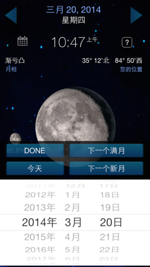 月相提供的关于月球的信息在你的位置,如在月相,亮度,日落,日出月龄和更精确的时间! 看月亮的样子,今晚,然后明天晚上,下,下。你可以看到什么月亮像以前的日子。请点击日历图标选择日期或移动到下一个新月或下一个满月。 月亮资料 * 精确的月相盈亏次 * 月相 - 月亮的照射(阳光)部分所看到的观察者的形状。 * 月球的年龄 - 在其周期多远沿着月球 * 的月亮照亮面积的百分比 * 月出和月落时间为您当前的位置 * 日出和日落您当前的位置 * 月龄 - 月龄是因为新月的天数。新的月球,当月球位于地球和太阳之间发生的月相。月亮是不可见在这个时候。 * 下一个新月的 - 天,直到下一个新月 * 下…