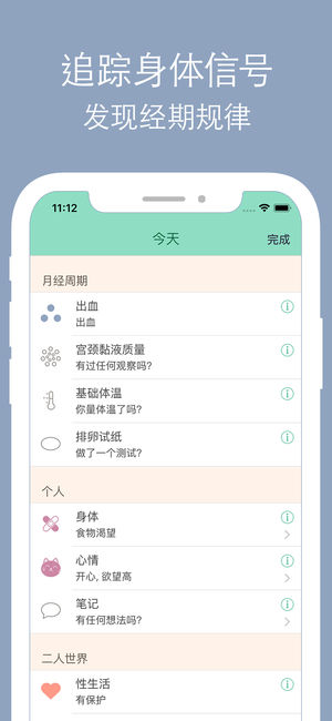 Cycles可跟踪你的行经期与排卵期,无需像其他应用程序那样繁琐的输入和维护。只需轻点日历输入你的上次行经期并选择周期长度即可。一切就这么简单! 为伴侣双方而打造 Cycles是唯一一款为伴侣双方倾心打造的生理应用。可邀请你的伴侣一同使用以与你的经期保持同步更新。这样他可以准备好提供感情支持,无需询问即可适时安排外出旅行和浪漫夜晚,以及备孕时了解最佳受孕期等。保证老公或男朋友会像你一样爱上这款应用! 精美易用 在漂亮的圆形周期图上一眼即可查看当前的行经期,还可在滚动的月日历上查看后面的经期。此外,还可设置个人提醒,如吃药,或接收“排卵期到来了”等生理提醒以方便备孕。你还可选密码锁来保护你的…