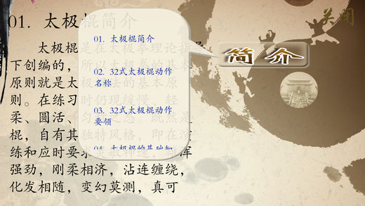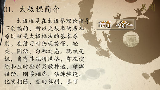 太极棍是在太极拳理论指导下创编的,在练习时仍现缓慢、轻柔、圆活、匀称之态。在演练和应时要求灵敏神速,雄浑强劲,刚柔相济,沾连缠绕,化发相随,变幻莫测,真可谓“摇动风车大旋转,前后左右都是棍,恰似疾风扫残云,酷似疾风扫落叶”。 青年人练此棍术,可以刚为主,刚柔相济,提高速度,增强体力;老年人练此棍术,则可以柔为主,练意练神,陶冶性情,祛病延年。 产品示范视频部分提供了32式太极棍介绍、太极棍单人整套演练和集体整套演练。同时配有32式太极棍的相关基础知识简介。 开发者信息 上海华烽电子商务有限公司是一家专注于移动应用开发的现代化高科技企业。旗下纳达书院(www.ndapk.com),面向智能手机用户和平板电脑用户,开发了音乐、诗词文、外语、早幼教、中小学、百科知识等系列移动应用。