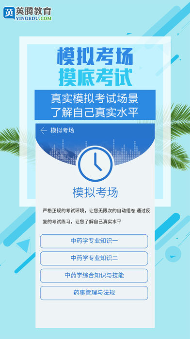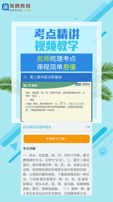考试宝典,让学习更简单!英腾专注医学教育12年,促进医学教育资源公平共享! ●考试宝典N+1全新学习模式,知识考点梳理+整套试题训练+精讲课程+解析答疑+错题重做,完整科学便捷的学习方式,高效省时准确率高,2017年执业职称考试轻松搞定! ●考试宝典的题库专、精、准、全面;能使您简单、快速掌握考试技巧和要点;易考常考题轻松把握,考试疑难杂症不在话下。 ●考试宝典实力强劲,名师亲选考点,精选上千套试题,配套视频讲解,导师在线答疑亲力辅导;实时同步2017年考试大纲和教材,覆盖30多个省市的书店,网络,培训机构! ●老品牌,好口碑代代相传,考试宝典助力执业职称考试。 2017年新版本,备考资料将更全面 部分新功能模块敬请期待,怎么学习由您选~~~~ 【在线题库】 我们的优势!章节真题,模拟试题,历年真题,专项训练,任你刷! 【考点精讲】—医药类科目 1、常考点视频讲解+考点内容详解+专项题目练习+智能测评,全套练习; 2、看完视频,做做题, 重点更清晰,掌握更全面,节省50%的复习时间 【错题精讲】-医学正副高科目 根据易错混淆题视频讲解,配套试题训练 【直播间】-执业考试、职称科目陆续开通 应试技巧,名师阵容,面对面讲解核心考点 【论文答辩,面试评审】 还原面试场景,洞察考官心理。模拟答辩提问环节,轻松应对面审,解读真实论文案例 【做题解析】 1.做题有解析,资料详解掌握更深 2.历年真题深度解析 ●几千个科目,你想考的,都在宝典里: 医学正副高职称,主治中西医师,住院医师,医技,主管技师,执业护士,主管护师,护理,药学职称,药剂师,主管药师,执业医师,执业药师,临床三基,执业兽医等;一二级建造师、初中级经济师等; @联系我们: 客服热线或QQ:4007278800 官方微信服务:ytksbao 交流Q群:275298838 官网:www.yingedu.com