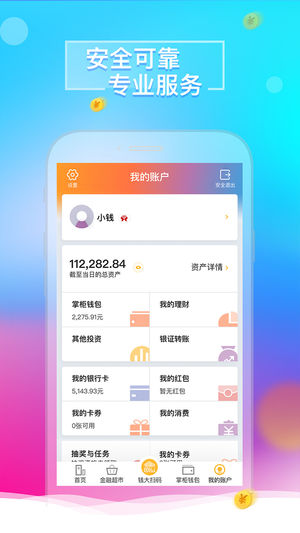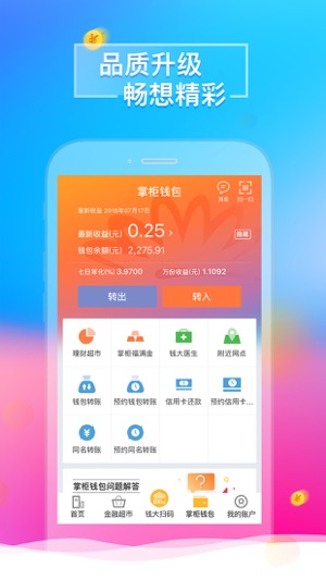 钱大掌柜,是兴业银行与众多联网合作机构共同打造的互联网综合财富管理平台,集掌柜钱包、银行理财、银证转账、公募基金、保险证券、贵金属等一站式全方位理财服务,让您足不出户即能实现财富增值。弹指间,理财梦想,一站直达。 产品特色 1. 高收益 -各项产品收益稳居市场前列 -常年发售高收益理财产品 2. 多选择 -掌柜钱包、银行理财、银证转账、基金、贵金属等品种全覆盖 -不同类型、收益率、期限等产品供选择,满足不同投资者需求 3. 低门槛(掌柜钱包) -最低1分钱起存,转入金额无上限 -打破时间限制,随存随取,快速取现 4. 超可靠 -整个系统的安全性由兴业银行保障 -多种安全措施,短信口令、密码加密…