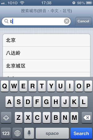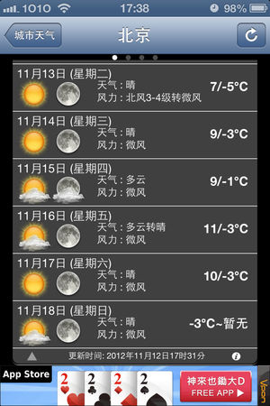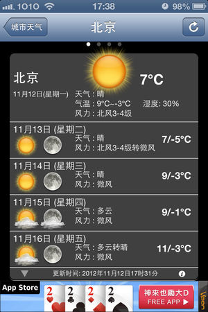 中国天气 Description 特色功能: - 支持7天城市天气预报。 - 支持同时浏览多个城市当天的天气状况。 - 方便快速切换。 - 支持全国包括港澳台地区 2000个城市。 - 支持拼音,电话区号,中文查询。 - 离线功能,在没有网络连接的情况下显示最后更新的数据。 **支持显示10个城市。 ##天气数据来自中国中央气象台 使用帮助: 使用‘中国天气’需要连接网络,请确定你的iPhone/iPod已连接到Internet。 添加城市: - 点击导航栏上 '+' 按钮进入添加城市页面。 - 输入你要查找的城市,支持电话区号…