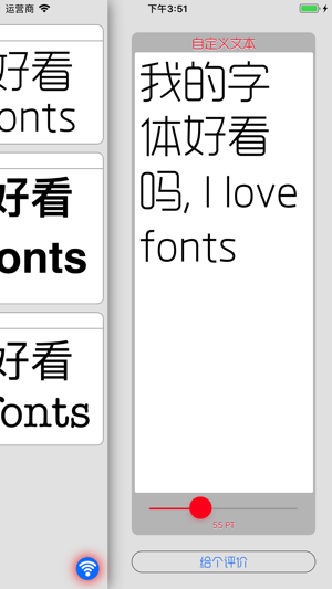 使用“字体预览”,你可以查看所有iOS系统自带的系统字体及安装任意第三方字体。 主要功能: * 在同一页面查看和比较不同字体的表现效果。 * 通过iTunes共享或者电脑浏览器安装用户字体,支持.otf, .ttc, .ttf, .dfont等格式. * 支持用户自定义文本。 * 更为重要的是,它是免费的!