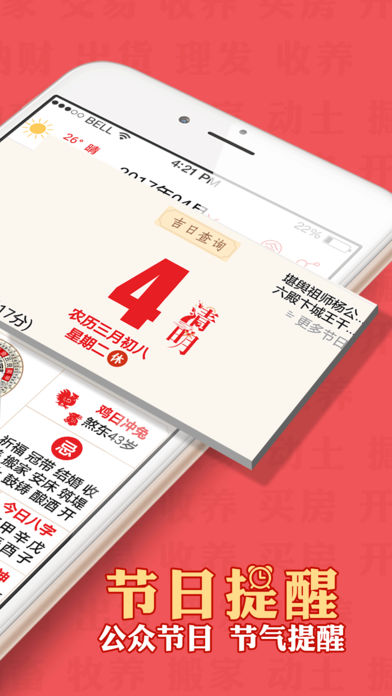 【温馨提醒】最新2017年公众节假日安排已更新,方便提前计划好2017年每个假期! 【最好用的手机万年历】中华万年历中的精品,集农历日历、黄历、天气预报于一身的手机万年历app。 万年历顺历,全球华人炎黄子孙的共同选择,爆款万年历日历应用! 每个中国人都喜欢用顺历,集万年历黄历、天气预报、记事、罗盘等于一身的生活好帮手! 传统文化与现代科技的完美结合,用户量最大的手机黄历软件!融合中国传统老黄历、精准天气预报、记事节日生日提醒、活动安排等,科学有序规划您的人生。 特别说明:择日功能已经移动发现栏目中,需要挑选好日子的同学请移步到发现栏目哦! 用顺历能做什么: 1、专业喜庆择日:选个好日子结婚、开市、旅行,事事顺心! 2、最精准的天气预告:提供一周天气预告,穿衣建议,让你出门既有温度又有风度。 3、贴心的节日提醒:港澳台等地区节日提醒,道历佛历应有尽有! 4、传统黄历宜忌:关注每天该做和不该做的事,事事顺利! 5、随身备忘录:搭配独家每日宜忌的记事功能,轻松安排日程。 6、打牌必备财神罗盘:专业财神方位指示,打牌打麻将必赢秘籍!