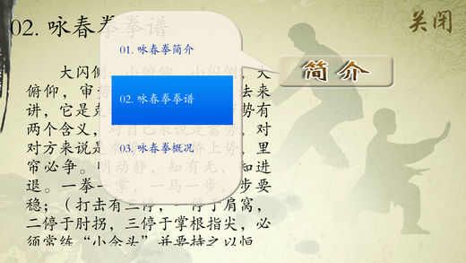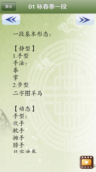 咏春拳是一种集内家拳法和近打于一身的拳术。它立足于实战,具有招式多变、运用灵活、出拳弹性,短桥窄马,擅发寸劲为主要特点,以大闪侧,小俯仰,耕拦摊膀,摸荡捋,审势记牢,曲手留中的手法,以搭、截、沉、标、膀、腕指、黏、摸、熨荡、偷、漏和“二字钳阳马”的身形步法为标志。凭借手桥肌肤灵敏的感觉,发挥寸劲力量的内家拳法。 产品示范教学视频简要介绍了六段咏春拳教学讲解(基本形态、单练套路全套演示、要点提示)、咏春拳的来历、咏春拳体系教学(英文版)。并配有“咏春拳”相关介绍(咏春拳简介、拳谱、概况、起源、流源宗谱、拳法特点、散打技术、咏春之马步、四门原理运用、十二式藤圈手、咏春木人桩、咏春气功、古劳咏春、社会评价等)及功法讲解招式名称的文字说明,便于理解。 《咏春拳》示范视频具体包含以下内容。 01 咏春拳一段 02 咏春拳二段 03 咏春拳三段 04 咏春拳四段 05 咏春拳五段 06 咏春拳六段 07 甄子丹讲咏春拳来历 08 咏春拳体系教学(英文) 开发者信息 上海华烽电子商务有限公司是一家专注于移动应用开发的现代化高科技企业。旗下纳达书院(www.ndapk.com),面向智能手机用户和平板电脑用户,开发了音乐、诗词文、外语、早幼教、中小学、百科知识等系列移动应用。