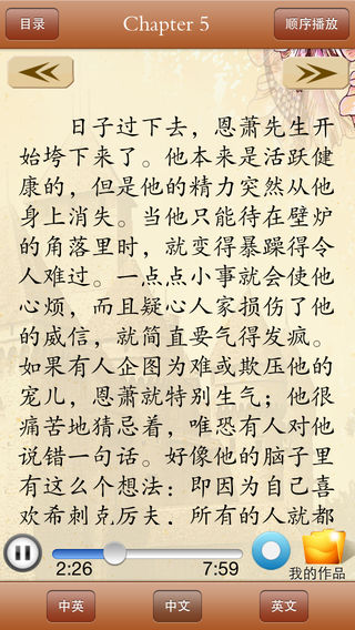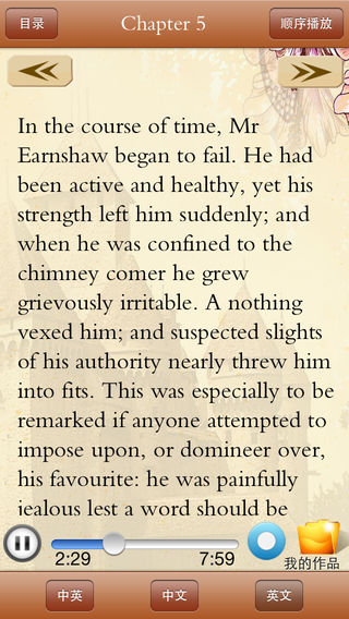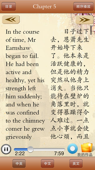 《听名著学英语》精选英汉对照欧美世界名著,情节连贯、引人入胜,由英美著名播音员倾情演绎。地道、纯正的发音极富感染力的演播,带给您纯美的感觉。听名著、看英文、迅速提高您的口语听说能力。产品有原版英文、中文翻译、纯正朗读三大特色,适合中、高级英语学习者。 《呼啸山庄》(Wuthering Heights)是英国女作家勃朗特姐妹之一艾米莉·勃朗特的作品。小说描写吉卜赛弃儿希斯克利夫被山庄老主人收养后,因受辱和恋爱不遂,外出致富,回来后对与其女友凯瑟琳结婚的地主林顿及其子女进行报复的故事。全篇充满强烈的反压迫、争幸福的斗争精神,又始终笼罩着离奇、紧张的浪漫气氛。 功能: •点触按钮播放/暂停音频播放功能。 •滑动屏幕点触控制翻看文本效果。 技术支持: 如在使用中有任何问题和建议可联系我们: 纳达书院QQ: QQ1:568791426 QQ2:2475369261 纳达书院微博: http://weibo.com/ndapk 开发者信息 纳达书院(www.ndapk.com)是广大移动用户掌上有声阅读的良师益友,是作者、小编们实现个人数字出版的梦想乐园,是上海华烽电子商务有限公司倾情打造的移动应用市场,她面向智能手机用户和平板电脑用户,开发了音乐、诗词文、外语、早幼教、中小学、百科知识等一系列的经典移动应用。
