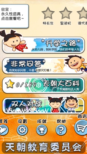 还记得小时候街机房的“民国教育委员会”吗?一堆人围在机器前七嘴八舌的抢着回答问题。还在用模拟器忍受着无数次的死机吗?现在不用再怀念不用再忍受, 《天朝教育委员会》就可以帮您找回童年~, 超过100个科目类别!8000多个知识性,趣味性俱佳的问题!只要达到60分就可以开始下一等级的学业!还有4种超强道具助您毕业! 那么就让大家一起开动脑筋来回答问题吧! ------------------------------ - 他们说: ------------------------------ ~周围的人被吸引过来一起参与答题,无意中拉近了人与人之间距离。 ~游戏的知识面,娱乐性很广。玩游戏的同…