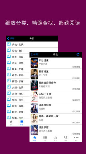 正版授权,完本图书榜单,为了方便您找书,对书城进行了最细致的分类,全部精排版人工制作,尊享最完美的阅读体验。 ◎女频言情 ◎玄幻奇幻 ◎科幻灵异 ◎武侠仙侠 ◎现代都市 ◎历史军事 ◎美文同人 ◎名著经典 ◎游戏竞技 阅读器功能介绍: 1.永不闪退:24小时连续使用稳定性保证 2.节省空间:随时删除看完的书 3.主题配色:白天、夜间、养眼六种主题配色 4.智能书签:自动记忆上次阅读位置书签 5.智能书架:自动置顶最近阅读书籍 6.飞速下载:10秒内下载完成百万字小说 7.图书精排:章节完整、规整段落缩进、无乱码 8.完美兼容:iphone、ipod touch和ipad设备