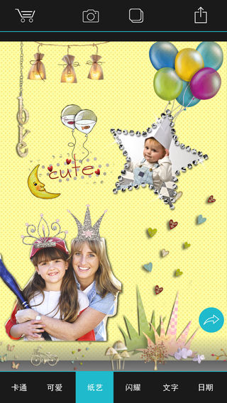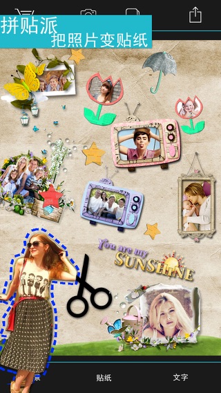 拼贴派,最新一代的拼贴应用,提供了非凡的创新功能和丰富的素材,让您尽情发挥想象力,创作出完美的拼贴效果! **特色** ===================================== - 新颖的剪裁功能,可以将您的照片制作成各种奇妙的贴纸效果 >标准剪切:可以将照片剪裁为矩形、圆形、椭圆、扇形等几何图形。 >自由剪切:轻松将照片剪切为任意形状,独创的预览功能可以实现鼠标操作般的精准度。 >特色剪切:提供了6大类别共90种独特的剪裁模板,将给您带来特别的惊喜! - 背景,应用内置了多款漂亮的背景,您也可以用任意照片做为背景。 - 贴纸,提供了5大类150种小贴纸,轻松点缀出您想要的效果! - 文字,您可以添加文字和各种风格的对话气泡,讲述您的故事吧~ - 日期,多种可爱的日历风格,可以给您的照片留下时间的记忆。 - 相框,提供了多种不同风格的相框,让照片变得更加美丽。 - 分享,您可以将您创作的作品保存到本地相册,也可以分享到Facebook,Twitter,微信,Instagram,新浪,QQ,或通过Email发送。 ------------- 如何导入字体 ------------- 您可以通过iTunes将电脑上的字体文件(*.ttf, *.otf)导入到“拼贴派”中。 1、选择您的iPhone(iPad、iPod touch)。 2、选择“应用程序”标签,然后拖动滚动条到界面底部。 3、选中“文件共享”下的“拼贴派”。 4、添加字体文件(*.ttf, *.otf)到“拼贴派”的文稿中。 5、重新运行“拼贴派”。