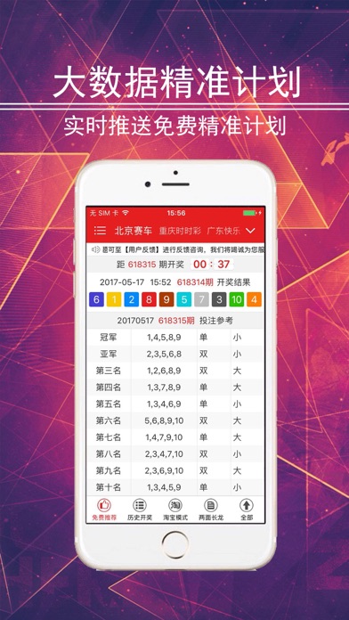 时时彩宝典是一款由香港皇家科技基于重庆时时彩、幸运飞艇、北京赛车PK10、新疆时时彩、天津时时彩等热门高频彩为内容,集历史开奖、统计资讯、推荐数据于一体的时时彩资讯应用。 时时彩宝典通过大量的数据,以及运用自主研发的分析时时彩的方法,率先实现了时时彩各玩法的推荐。 【特色服务】 1. 视频开奖 ◇实时视频开奖,让开奖也能更有趣; 2. 历史数据统计 ◇多种玩法历史数据统计:大小、单双、龙虎..... 3. 长龙提醒 ◇两面长龙自动统计各种龙,让您赢钱更简单; 3. 遗漏及冷热号统计 ◇遗漏数据实时更新,冷热号数据统计让你有据可依。 用时时彩宝典,赢钱根本停不下来。 (App内提供的内容及活动与苹果公司无关)
