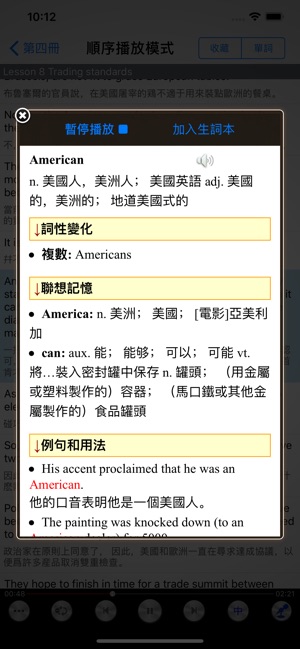 新概念英语词汇语法精华精讲 全方位的内容覆盖 支持线控操作模式, 它会成为你学习新概念英语最得力的助手与朋友! 所有内容均为离线模式,不需要连接互联网,软件支持iPhone、iPod touch、iPad等各版本的硬件设备, 由于软件体积较大,请在Wifi环境下下载。 软件特色 1、1-4册所有词汇语法精华全覆盖 (无任何功能与内容限制)。 2、有声全文词典 最正宗的美式/英式发音。 3、多种播放模式选择, 支持后台模式。 4、生词字典:每个单词都提供详尽的解释、音标、发音、例句用法、联想记忆、同义词辨析、英英解释等等,每个单词都可自主加入“生词本”中,帮助你快速记忆学习英文单词。…