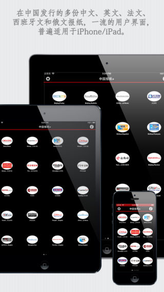 中国报纸+:在英国和德国最畅销的新闻应用程序现登陆中国。 报纸 : China News, ShanghaiDaily 上海日报, Xinhua 新华社, People's Daily 人民日报, Global Times 环球时报, The Economic Observer 经济观察报, ChinaByte 比特网, FT中文網, 东方早报, 环球网, 北京晨报, EastDay 东方网, Yanzhao Metropolis Daily 河北新闻, 21世纪网, People's Daily English, China Business News, CCTV International English, Shanghai Sun, The Economic Observer English, Xinhua English, BeijingToday, Beijing Bulletin, China National News, 大洋网, Peking Press, Guangzhou Daily 广州日报, Xinhua Español, Xinhua Français, People's Daily Français, People's Daily русский, Yun Nan Daily 云南日报网, Beijing Review, CCTV International русский, China Internet Information Center, China Radio International English, China Radio International русский, China Briefing, 体坛网 部分特色: + 在中国发行的多份中文、英文、法文、西班牙文和俄文报纸,一流的用户界面,普遍适用于iPhone/iPad。 + 按版面阅读每份报纸:世界、本地、政治、体育、商业、技术、科学、健康、艺术、旅行等 + 按一下即可将文章分享到Facebook。此外,您可以复制文章,用电子邮件和短信发送文章,也可以在Safari中打开文章。 + 按一下即可将所有报纸下载到您的iPhone/iPod Touch。您无需网络连接即可阅读所有报纸的文章(仅限于标题和摘要) + 根据您的意愿将报纸/版面放置到头版 + 为视觉障碍的用户提供VoiceOver语音支持 + 应用程序已本地化为10多种不同的语言 部分评论: + “精选的新闻来源,可轻松阅读我感兴趣的新闻。简单的用户界面设计,一切都只需按一下手指” - 用户评论 我们希望听到您的意见,欢迎将您的意见发送至:support@sunflowerapps.com,您也可以直接在AppStore上撰写评论。