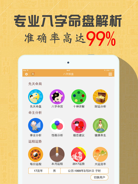 八字测算命理大师,随身查看运势运程。最新2017年运势分析!周易占卜测算,流年财运事业感情走向,最专业八字排盘应用。 最好的八字算命应用!八字排盘是中国人民传统文化的结晶,经历几千年的岁月而沉淀下来的民族精华,具有独特的神奇的未来预测功能。八字排盘提供精准算命,为您通晓未来,让你为接下来的未来做好充分的准备。 【八字排盘】 通过生辰八字组合出你的先天的命局,详细的命盘解说,配合阴阳五行,精准分析你的未来发展趋势,让你把握大运之年,提升事业、爱情、财运等运势。 最新2017年运势分析,提前预测分析你的运程,掌握最新运势走向,为未来提前做准备,让你始终快人一步,准确把握机遇,创造属于你未来。 自己的命运自己掌握,可是如果连自己的命理运势都不知道,你又该如何改变命运呢? 【主要功能】 1、八字算命:国内著名命理老师亲自指导,免费看排盘,周易占卜测算,为您专业提供命理信息; 2、运程分析:大运年表、流年运程为您分析一生运程起伏,流年趋吉避凶。十神、命宫详解让您知晓先天运势、命运的主轴、行运的源头。 3、婚恋配对:看桃花,定姻缘,帮你找到身边的那个TA; 4、命主分析:性格、事业、星座分析全面独到,精确预测您人生的贫贱富贵,让您更了解自己。 5、健康养生:提供专业养生要点,为您调整饮食和生活起居,助您保持健康。 【应用特色】 〖简洁易用〗国内著名命理老师亲自指导,打造最简洁易用的八字组盘解盘命理应用。 〖专业免费〗免费看排盘分析,提供八字干支、十神、五行、大运年等专业命理信息。 〖流年大运]〗大运年表、流年运势等全面分析你的一生运程起伏,让你流年趋吉避凶。 〖命宫详解〗命宫详解让你了解流年运程、知晓先天运势、命运的主轴、行运的源头。 〖分析全面〗事业、婚姻、财运、健康等讲解全面独到,精确预测分析你的人生运势。 〖开运转运〗提供各种开运转运方法,方方面面、随时随地避煞转运,轻松度过难关。 八字排盘流月分析: ¥18/月 订购八字排盘流月分析可以通过itunes账户的信用卡直接付费。如果当前订购周期(一个月)结束前24小时内未取消续订,我们将会自动为您续订下一周期的八字排盘流月分析。在订购有效期内,无法取消。订购成功后,可在“账户设置”中管理自己的订购服务。 【联系我们】 我们始终把用户的心身放在首位 通过以下方式随时关注和联系我们,让我们共同打造专业的命理应用 官方微信:lingjimiaosuan 官方网站:m.linghit.com