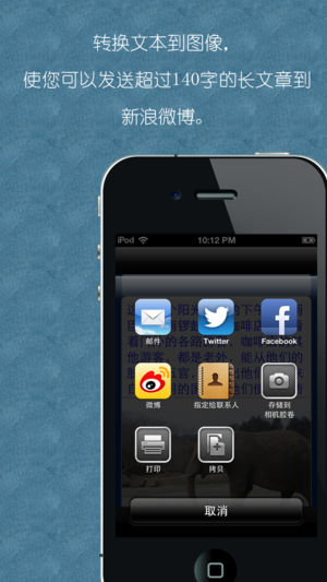 功能: 1.转换文本到图像,这样您就可以发送超过140字的文章到新浪微博。 2.您还可以改变字体,文本颜色和大小。 3.您可以从相册中选择图像插入或拍新的照片。 4.保存图像到本地以随时查看或发送,也可以使用别的app打开本地文件。 5.支持多节点,可以合并多个图像及文字。 注意:在使用前,请先在iPhone的设置里配置好您的社交帐户。