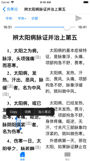 《伤寒论》为汉代著名医学家张仲景所著,被历代奉为中医的经典著作。该书运用辩证论治原则和方法,确立了中医诊治疾病的规范;所记述的理法方药相结合的辨治经验,对中医临医学的发展影响,极其深远;所记载的大量复方,组方严谨,疗效显著,被后世称作“众方之祖”。 本软件《伤寒论》具有以下特点: 1、文白对照。文言文和白话文同屏显示,支持对照和交替排版,轻松读阅读中医著作。 2、原文注释。原文附带注释,点击直接查看注释,加深阅读理解。 3、真人朗读。真人朗读优美动听,让你在眼睛得到休息的同时通过声音领略经典中医著作的魅力。 4、内置词典。内置文言文字典和高级汉语词典,阅读时遇到难懂的字、…