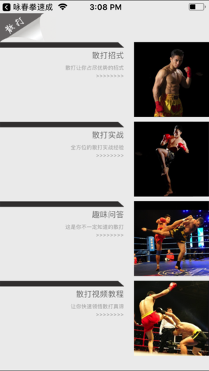 App Store中最据权威的散打教程。让你从菜鸟到高手的必备神器。 速成:只要你对武术有一点点兴趣,打开教程看一看,分分钟让你成为散打界中的“武林高手”! 易学:我不是一本枯燥的散打教科书,用文字来阻碍你的行动,我是一个简简单单按照视频步骤动起来,就一定能够成功的宝典式App! 随时随地:利用你的任何时间,上班公交车,下班挤地铁,什么时候想看了拿出来看看,有空的时候照样做一做,你的武艺时时刻刻都在不断提升。 本App中还有私人教学,散打界明星手把手为您演示,让您深度了解散打的各种招式。