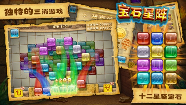 最独特的消除解谜游戏新鲜出炉啦!! 宝石星阵是结合了麻将对对碰和经典消除游戏玩法的解谜游戏。 你的目标是消除每一关卡所摆放的十二星座符文宝石。通过拾取相同颜色的宝石进行配对。 ----------------------------------------------- 游戏玩法: ● 游戏刚开始下方会有一个收集框,一共能够放下7颗宝石。 ● 点击游戏场景里面的宝石的话,宝石就会自动被收集到下方收集框。 ● 在你所有收集的宝石中如果含有同种颜色的宝石超过了3个,那么宝石就会被清除掉。 ● 如果下方的收集框所收集宝石的数量超过了收集框的最大容量(7个),那么游戏将会结束。 ----…