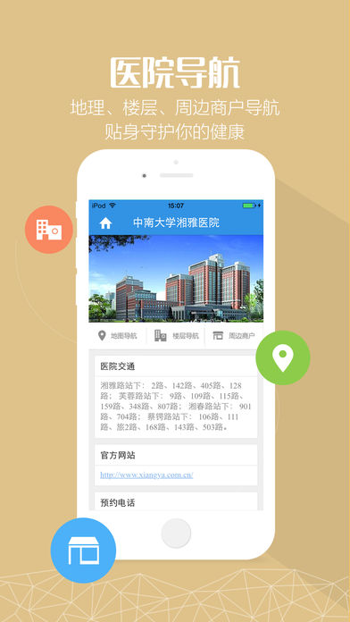 “掌上湘雅”是中南大学湘雅医院为缓解传统就医时间繁杂开发的手机应用。依托医院信息化建设,将服务的触角延伸到院内、院外与患者相关的几乎每一个角落。平台服务涵盖报告单查询、智能导诊、专家排班功能。我们旨在现有服务基础上简化就医流程,减少等候时间、方便患者就医、改善患者就医体验、提高患者就医满意度。 ======主要功能====== 1、智能分诊:模拟临床医生问诊流程,通过自检就能初步评估自身病情; 2、手机挂号:掌上实时挂号,短信凭证高效就诊; 3、取报告单:在家也能取报告单,无需往返医院查询、取单; 4、医院导航:院外线路导航、院内科室分布、周边商户一网打尽;此外还有健康百科、健康资讯等实用功能,为您的健康保驾护航。 ======声明====== 掌上湘雅是中南大学湘雅医院与杭州卓健信息科技有限公司联合研发