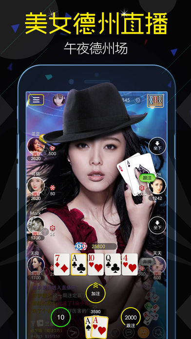 【全球首款真正的美女主播德州扑克】真人美女荷官直播,简单极致的德州体验,和心仪的主播互动游戏。“TA来了,你在哪?” 【真人美女主播+德州扑克】 和美女主播一起玩德州,性感荷官、白富美、小清新、高富帅等着你! 【精致优雅的界面】 颠覆传统的竖版界面,单手操作轻松方便,华丽界面让您如临真实的德州赌场! 【喜欢就要打赏】 手气好记得和主播一起分享,爱“TA”就要赏给“TA,缤纷礼物赏不停。谁的爱多一点,奖赏榜上一目了然! 【停不下来的奖品】 完全免费,筹码天天送!还有大量奖品等您拿! 【私密组局随心开】 亲朋好友一起玩,还能直播聊天与互动,更随心更私密! 【丰富的社交系统】 赏金排行榜,与好友比拼牌技和财富;丰富的礼物互动,玩牌交友两不误! 【全新比赛系统系统】 全新比赛系统,坐满即玩(SNG);多桌锦标赛,争夺冠军(MTT) 【更多惊奇玩法】 水果机、猜拳、足球竞猜……更多有趣刺激的活动等你来发现! QQ群:232091902 客服QQ:447672656