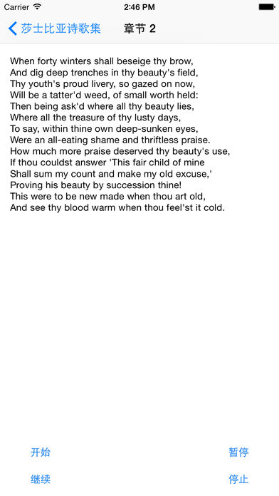 威廉·莎士比亚(William Shakespeare,1564-1616)是欧洲文艺复兴时期英国最重要的作家,杰出的戏剧家和诗人.app中收录了151篇莎士比亚的诗集. 功能说明: 1.莎翁诗集151篇 2.流利的英文朗诵,学习莎翁诗集朗诵的利器 3.设置字体 4.查看历史浏览记录