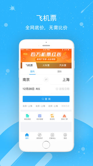 【国内机票】国内机票,底价优惠袭来,往返立减20; 【国际机票】全球国际飞机票,千余条航线等您来选; 【在线支付】支持微信、支付宝、银联信用卡支付方便快捷; 【火车票】火车票订票,抢票,支持12306网站购票; 【汽车票】支持全国联网汽车票订票,网上订票车站自取; 【特惠酒店】全国精选机场火车站附近特惠酒店等你来订;