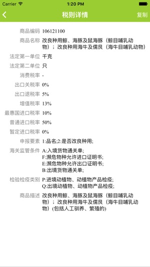 本软件收录了1万1千多条海关税则数据,您可以使用“商品编码”或“商品名称”进行检索,结果页所包含的信息有:商品编码、商品名称、申报要素、法定第一单位、法定第二单位、最惠国进口税率、普通进口税率、暂定进口税率、消费税率、出口关税率、出口退税率、增值税率、海关监管条件、检验检疫类别、商品描述。 HS CODE是《商品名称及编码协调制度》的简称。编码协调制度由国际海关理事会制定,英文名称为The Harmonization System Code (HS-Code),是对各种不同产品出入境应征/应退关税税率进行量化管理的制度。