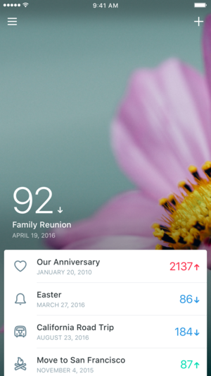 Dreamdays 4.0来啦!伴随着迄今为止最大的设计升级。拥有Dreamdays,你可以看到你的重要事件被时间或分类依次展示,同时你还可以为你的事件配上心仪的背景图片或是一份语音记录下的心情。当然,和朋友们分享你的喜悦也是必不可少的,快通过Dreamdays内置的Facebook,Twitter,Instagram分享给你的好友们吧! 主要功能: - 倒数你的事件,或是正数已经过去的事件 - 天数与年/月/日展示模式并存,更好的展示您的事件 - 最新支持精确到秒的事件倒数,更细致的记录重要事件 - 六种自带精美图标的默认分类(纪念日,生日,节日,生活,学校,还有旅行);当然,你还可以自由…
