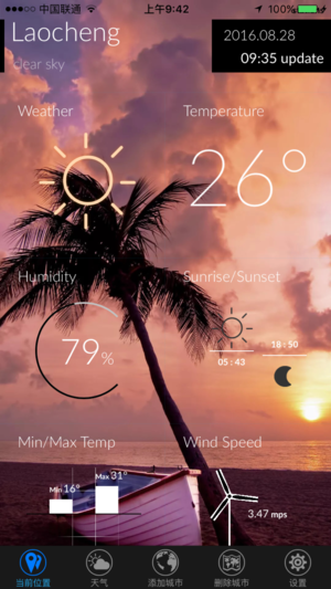 在这里,你可以随意了解当前位置天气信息; 在这里,你可以尽情掌控全国所有城市气象情况; 在这里,给你最温馨的温度提醒和出行关怀。 无论刮风下雨,无论电闪雷鸣,随时随地做你最忠诚的伴侣!