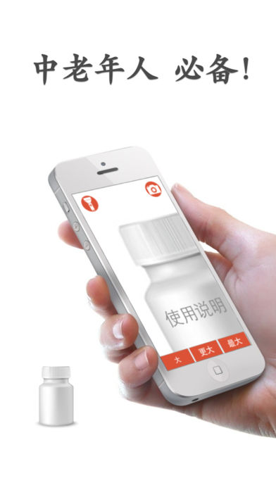 帮助患有“老花眼”的老年人提高日常的阅读能力。 每年,有数百万老年人因为看不清药盒上的说明,而错误的服药。 他们需要帮助,请帮助他们下载这款APP,改善生活质量。 ----------------------------- 再也不用担心爸妈忘带老花镜了 ----------------------------- 针对老年人的生活和生理特点进行了特殊设计: 1、简单、且字体巨大的【放大按钮】 2、三个放大倍数,满足日常所需 3、手电筒功能,对可视范围进行补光,更加有利于阅读 4、拍照功能,可以随时将放大后的内容进行拍照,存入手机相册 ----------------------------- 随着中国逐步进入“老龄化社会”,过亿的中老年人需要社会的关注和帮助 我们将陆续推出和完善针对老年人生活的工具APP 感谢您的支持与支持!!!