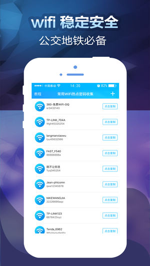 这是一款Wifi能分享周边的密码,让你的朋友享受免费上网,能够帮助用户链接开放的WiFi热点信息。 1.WiFi支持密码查看 2.分享可用的WIFI热点 适合同事、朋友、家庭间wifi密码查看,随时随地轻松接入安全的无线网络。