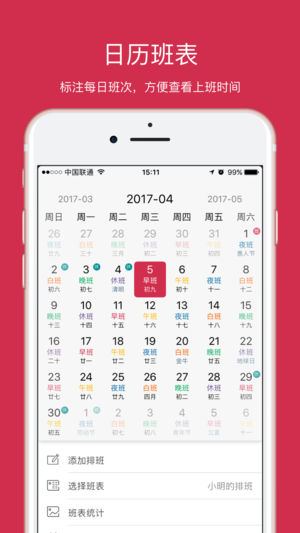 排班 - 上班时间,一目了然。 # 简介 [排班]顾名思义,是一款以日历为基础,记录上班时间的应用。主要针对实行倒班制,上班时间不固定的用户。简单两步设置,便能准确地在日历上排列出上班时间,查看方便,一目了然。不用在台历上拿笔标记,也不用时时去看主管给你的上班安排。让你告别上班时间不确定的痛苦。 # 功能 * 丰富而简洁的日历信息 * Widget 显示,让查看日历和班表更快捷 * 循环排班,一次设置,便能推算出N年班表 * 添加多个班表,自由选择显示,想加多少就加多少 * 自定义待选班次,让排班更自由 * 随意修改已排好的班次,突然的调班也不会错过 * 每月班表统计,本月上了几天班,…