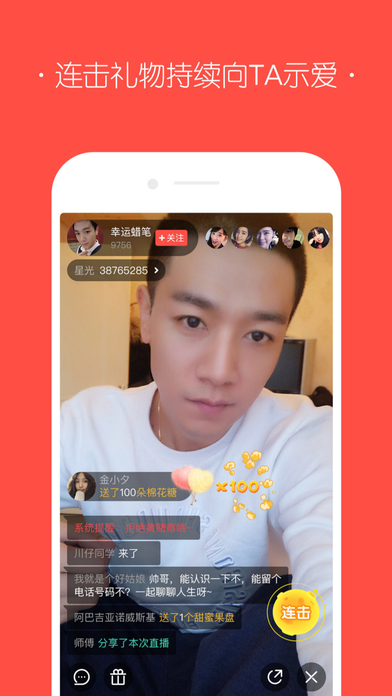 【手机直播】 人人都是明星,开启手机直播,随时随地直播你的所见所闻,分享属于全民的狂欢 【特色功能】 √观看直播:主播为你视频直播K歌唱响,表演逗趣,喊麦搞怪,永久免费欣赏。 √聊天交友:无论你生于何时,身处何方,此时此刻我们欢聚一堂,悄悄话,小喇叭,胡聊海聊谈天说地。 √表达爱意:上百种精美礼物供你赠送给心仪的,表达心中爱意,数十万看客见证爱的奇迹。 √身份标识:通过赠送免费礼物,趣味礼物,中奖幸运礼物……可获得从布衣到神的专属身份标识。