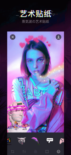 VaporCam,超现实图片编辑器,打造酷炫的蒸汽浪潮。 全系列复古、蒸汽元素的滤镜贴纸,浓厚的黑暗潮流气息。 VaporCam,坐上挂满霓虹灯的时光机,带你穿梭到八、九十年代 在蒸汽弥漫的梦中停滞、沉浸 用已脱离肉体的真实感官,在怀旧中感受现代 在欲望、情感与自由之中,感受蒸気波的意乱情迷 • Vapor,滤镜 / フィルター 特别的 Lo-Fi 低保真效果 仿佛瞬间穿越回80年代,看着粗糙且跳帧的录像带 迷醉与暗黑的幻觉,让人目眩的同时,也让人无限上瘾 • Vapor,贴纸 / スタンプ 数百张蒸汽波不同风格的贴纸资源 日系、电子、复古、雕塑、海豚、拼贴、80年代的街机与像素风……
