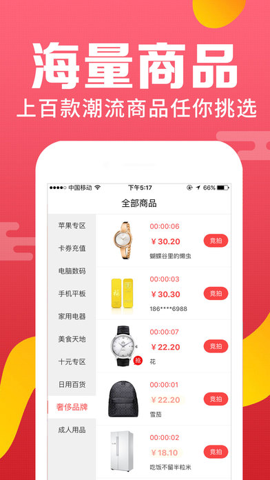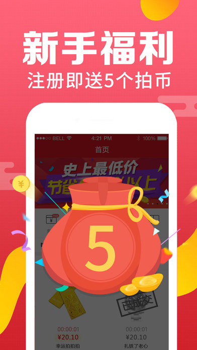 天天竞拍,一个颠覆传统拍卖规则趣味无穷的全新应用。 革新竞拍模式让你以成本加10%的价钱拍下你想要的商品。 给您提供一种惊喜不断充满激情的拍卖过程。 【竞拍规则,10秒竞拍】 全场商品0元起拍,每拍一次价格只上涨0.1元,10秒内无人竞争,您即可以前所未有的低价带走心仪商品 【海量商品,任君选择】 最新手机电脑、数码照相、金砖珠宝、护理化妆、日常家电,上千种最新、最潮的商品应有尽有,想拍就拍! 【过程透明,公平公正】 已有3215万用户晒单分享,91%用户拍下商品低于市场价1折。一款真正的用零花钱即可实现您的购物梦想的全新应用, 【新人福利,注册送5拍币】 注册立送5个拍币,助你竞拍心仪商品。 (特别声明:本应用所有活动与内容跟苹果公司无关)