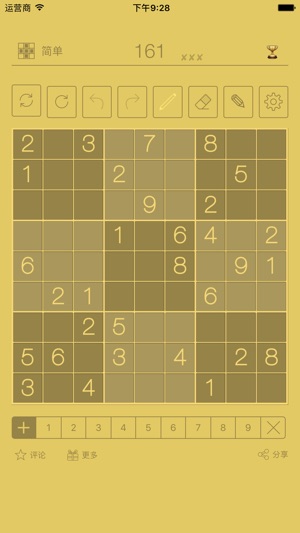无数的数独谜题等待着智慧的您。 每解决一个数独谜题就能获得积分,提升您在世界数独排行榜中的名次。 独一无二的土豪金界面让您获得非与伦比的尊贵享受! 1)无穷的谜题,绝不雷同! 2)简单级到骨灰级,总有适合您的! 3)实用丰富的解题工具,摆脱乏味,增添乐趣! 4)多种界面风格,适合独特的您!