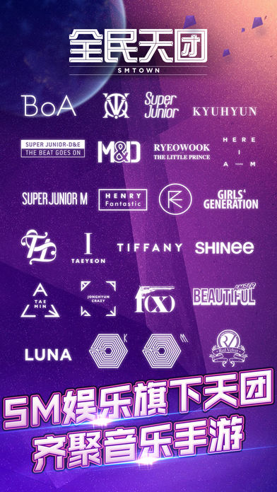 【游戏特色】 -SM娱乐旗下天团齐聚音乐手游 游戏由韩国SM娱乐有限公司(S.M.Entertainment)正版授权制作,旗下代表艺人包括有EXO、TVXQ!、Super Junior、Girls’ Generation、SHINee 、Boa等等备受粉丝喜爱追捧的艺人尽收录在内。 -多种主题炫酷爱豆卡牌等你收集 《全民天团》的推出,粉丝通过搜集及升级不同偶像的卡牌,可以随时随地体会到偶像在身边的乐趣,是名符其实的追星神器 -百首金曲 尽享绝妙视听盛宴 游戏最大的特点就是里面的歌曲都是由 SM 旗下颜值爆表的艺人卡牌、脍炙人口的成名曲组成,而且会持续更新艺人最新曲目。弹奏的同时,赏心悦目。 -敲击滑动屏幕操作享受指尖盛宴 游戏在传统敲击音符玩法基础上加入滑动屏幕的操作方式,含有玩家对战和闯关系统,玩家可以在劲爆的音乐节奏下,在移动设备上尽情弹奏。 联系我们: Email:qmtt_gm@5dsy.cn 客服QQ:4006840808 官方QQ群:261291444