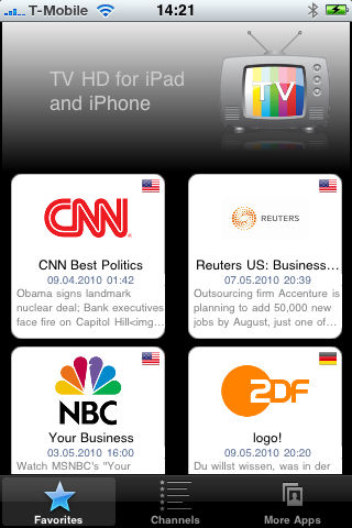 TV HD converts your iPad, iPhone or your iPod touch to an mobile Wifi television. Whenever and wherever you want, completely independent from any broadcasting times, TV HD keeps you up to date. TV HD offers you actual and important shows in following categories: News, Sports, Business, Entertainment, Chrildren und Weather. Broadcasts from following countries are supported until now: Germany, USA, UK, France, Swiss, Australia. We are continuously exerted in keeping content up to date and allocate new channels and shows. Please feel free to send us reviews, any request for changes or requests for new channels or shows (info@i-app.net). Disclaimer: When you have select a video you'll be linked to the original server on which the content is provided. This content could also be viewed with iTunes or YouTube. We're only providing a link collection.The content may vary and channels or shows may be deleted without any notice. If any channel or show couldn't be provided any longer, you're not approved to restore the app.