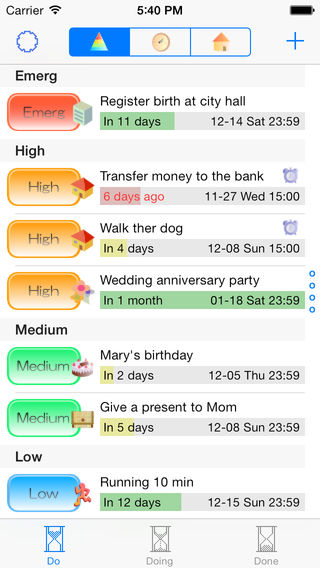 version 1.2: 修正了中文的翻译 修正了问题 ************************************** 愉快的待办事项管理体验,在 代办-进行中-完成 三种状态中灵活切换! ************************************** 您是否曾经经历过: 您有太多的工作要安排? 您想按优先级区分工作? 您担心忘记之前制定的时间表? 您不愿意忘记朋友的生日? 您想要为纪念日准备一份很棒的礼物? 您想要提醒您的孩子参加运动会或学校访问日? 这款应用程序帮助您方便地记住并完成您的待办事项。 它不只是一款实用的待办事项管理工具,同时也是您的个人信息管理工具。 您可以设置每个注册事件的截止时间。状态栏会显示待办事项的剩余时间,天数和月数。 你也可以按代办事项,进行中事项,以及已完成事项来分类整理所有事项,并可以一次点击来切换视图。简单并且快捷。 您可以设置至多 4 种优先级别,让您能轻松了解您当前最重要的待办事项。 添加分类图标来显示待办事项的类型。 您可以按日期,优先级或图标来分类待办事项。 功能 简洁的用户界面和简单的事项录入 设置截止日期 设置优先级 状态栏直观显示余下的剩余天数 按截止日期,优先级或分类图标分类 通过添加图标来管理待办事项 通过日期和时间来管理 如何操作 屏幕下方状态栏切换“代办”,“进行中”和“完成” 中上方图标用于按优先级,截止日期和图标来分类事项 右上方按钮用于录入新的待办事项 左上方按钮用于更改设置 点按已录入的待办事项来切换至编辑页面