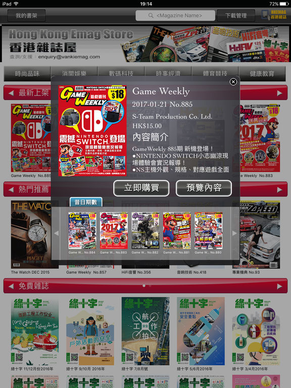 香港雜誌是香港第一個專為iPad用戶而設的雜誌專賣店,搜羅全港大小暢銷雜誌,為本地及海外讀者帶來全新的閱讀感受。目前,代理的雜誌包括:音响技術、HiFi Review、The Watch, WineNow 酒經、HDAV、Game Weekly遊戲週刊、職安局綠十字及HyperZpeed專業機典等等…….