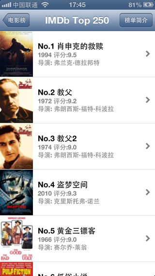 电影榜 Pro目前带有六十多个各种各样的电影榜单, 软件中既有常见的豆瓣电影250榜单, 也有较为少见的电影学院榜单, 还有最新的豆瓣新片榜。虽说不论任何榜单, 都不可避免地带上榜单制作者的主观意见, 不可能满足所有人的趣味, 但是在浩如烟海的电影中选择影片观看时, 结合一些已有的电影榜单是有益无害的。电影榜软件既适合榜单控、数据帝查阅, 更适合一般观影者作为参考翻阅。 目前支持以下电影榜单: 1 IMDb top 250 2 时代周刊--全球百部好看电影 3 豆瓣电影250 4 电影旬报--20世纪最佳100部日本片 5 豆瓣高分动画长片 6 戛纳电影节金棕榈影片 7 2011年好莱坞新片上映清单 8 奥斯卡最佳影片 9 北京电影学院硕士要看的100部电影 10 北京电影学院本科生必看100部 11 香港电影金像奖:最佳华语电影100部 12 戛纳电影节评审团大奖 13 北美电影票房总排行榜 14 北美周末票房榜冠军影片 15 香港金像奖协会179部经典港片 16 励志电影 17 看电影--100部最好的韩国电影 18 奥斯卡最佳外语片 19 金球奖剧情类最佳影片 20 电影世博会 21 伊朗电影巡礼 22 柏林电影节金熊奖影片 23 中国百年百部电影佳作(1905-2005)中国电影资料馆 24 法国电影手册年度十佳(2000-2009 25 威尼斯电影节金狮奖影片 26 法国电影恺撒奖最佳影片 27 金球奖喜剧类/音乐类最佳影片 28 稀有未知好电影 29 AFI美国电影学会百年百大明星 AFI's 100 Years…100 Stars (1999) 30 AFI美国电影学会百年百大爱情电影 AFI's 100 Years... 100 Passions (2002) 31 AFI美国电影学会百年百大惊悚电影 AFI's 100 Years... 100 Thrills (2001) 32 AFI美国电影学会百年百大喜剧电影 AFI's 100 Years... 100 Laughs (2000) 33 AFI美国电影学会年度十佳电影 AFI Awards the Best 10 Movies of the Year (2001-2010) 34 豆瓣新片榜 35 奥斯卡最佳男主角获奖与提名 (1990-2009) 36 奥斯卡最佳女主角获奖与提名 (1990-2009) 37 卫西谛--15年来最获好评的150部电影 38 娱乐周刊--百部电影新经典 39 2010豆瓣电影口碑榜 40 容易忽视的好电影 41 让人内牛满面的电影 42 心理学电影 43 豆瓣高分短片 44 深情即是一桩悲剧,必得以死来句读 45 很轻的电影和很重的人生 46 He loves a man, she loves a woman 47 100坏电影|影响极坏 48 几近五星的豆瓣电影 49 土星奖最佳科幻电影及提名 50 豆瓣高分纪录片/其它 51 豆瓣五星电影集中营1 52 豆瓣五星电影集中营2 53 豆瓣五星电影集中营3 54 ★豆瓣高分电影榜★ (上)9.7-8.6分 55 ★豆瓣高分电影榜★ (中)8.5-8.3分 56 ★豆瓣高分电影榜★ (下)8.2-8.0分 57 IMDb科幻类电影Top500(001 - 250) 58 IMDb科幻类电影Top500(251 - 500) 59 冷门佳片 60 新千年科幻电影推荐(1999 - ) 61 Top 100 Sci-Fi TV Shows 62 血族的影像