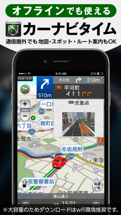 【国内初】道路地図データ生成自動システムで地図即時反映が可能に! * 受賞暦 * ◆『2016年度グッドデザイン賞(ナビタイムマイレージ)』を受賞しました! ◆第7回ATTTアワード「コンテンツ・サービス部門」で優秀賞を受賞しました! ◆モバイルアワード2015の「交通系アプリ」で3冠達成! お持ちのカーナビ、地図が古くなっていませんか? カーナビタイムはオフラインでもナビが使える高級感にこだわった本格カーナビアプリです。 地図や駐車場などのスポット情報は常に最新情報で更新され、リアルタイムな渋滞を考慮したナビゲーションを行います。 高級感にこだわった、きめ細やかなナビゲーションであなたのドライブをサポートします。 バイクやトラック、大型車など幅広い車種に対応し、それぞれの車種にあった最適なナビをご提供します。 最新技術で進化し続けるカーナビタイムでより快適なドライブをお楽しみください! ※本アプリケーションはオフラインでも使用できるよう地図データ等をローカルに保存します。そのため、サイズが1.48GBがあり、ダウンロードにはWi-Fi接続が必要です。Wi-Fi環境にない方やアプリサイズが気になる方はダウンロードにWi-Fi環境が不要なナビタイム「ドライブサポーター(65.8MB)」もご検討ください。ドライブサポーターでスマートフォンがカーナビに! ◆月額コースには初回に限り、1ヶ月のお試し期間が用意されております◆ 【カーナビタイムの特長】 ■地図を遠くまで見通せる、3Dスカイビュー表示 ・地図を3Dモードにすることで2D表示時より先まで見通すことができます ■愛車のあらゆる記録を残す「車両管理」機能 ・給油の記録から、燃費を自動で計算 ・燃費の推移をグラフで分かり易くチェック ・プロフィールに愛車の写真をセット ・タイムラインで愛車の記録を見易く振り返る ■トラック向け&バイク向けのルートを探索 ・車種ごとの料金案内や一部の通行規制を考慮します ■安全な運転をサポートするオービス通知 ・ルート案内中にオービスが近づくと音声と地図上のアイコンでお知らせ ■声でアプリを操作できる「ボイスコントロール」機能 ・音声で地図の操作、スポット検索、自宅までのルート案内開始など多くの操作が可能 ・「渋滞」と発話することで、ラジオのような道路交通情報をお知らせします ■Apple Watch Apple Watch を併用するとドライブがもっと便利に! ・ドライブの進捗状況をサッと確認 Apple Watch 上で案内の進捗率や、目的地までの残り時間・距離を確認できます ・ルート上の渋滞状況をひと目で把握 ルート上の渋滞・混雑状況を色で表現。休憩などの目安にご利用下さい ■最新の渋滞情報や未来の渋滞を予測したルート検索&リアルタイムリルート提案 ・1分ごとに更新されるVICS渋滞情報と過去の渋滞情報から未来の渋滞予測を考慮し、快適なルートを提案 ■通信圏外でのルート検索&音声ナビゲーション ・オフラインでも端末に保存した地図を利用してルート案内が可能!リルートも高速 ■常に最新の地図&スポット情報 ・通信圏内では、最新の地図でナビゲーション ・スポット情報もメジャーな観光地から穴場まで豊富に取り揃え、デートや旅行などのお出かけのプランニングにも ■いつもの道をアプリが学習して優先的に使用 ・走行履歴を学習し、よく走る道を優先的に通るルートを検索 ・よく走る道に交通情報があれば起動時にそれをお知らせ ■突然の雨にも安心!目的地のお天気情報や未来の降雨情報を提供! ・ルート案内開始時、案内中、到着時に目的地や経路上の天候情報をお知らせ致します ・1時間前から6時間後までの全国の降雨情報を地図上でサッと確認できます ■交通情報を簡易マップで表示 ・全国の渋滞・規制情報を一つのマップ上で確認可能 ・12時間後までの渋滞予測情報も閲覧可能 ・全国のSA・PAの施設情報や満空情報も閲覧可能 ■リアルタイムな駐車場満車空車情報&ガソリン価格情報 ・駐車場の満車空車情報を地図上にアイコンで表示(※1) ・地図上のガソリンスタンドに最新のガソリン価格を表示(※2) ■お得で便利なクーポンがご利用いただけます ・ぐるなび、ホットペッパーのグルメクーポン ・るるぶ、JTB、じゃらん、一休、楽天トラベル、日本旅行サイトへの有名宿泊施設への簡単予約 ■iPadの大画面なら、地図を見やすくお使いいただけます ■PC版NAVITIMEにもログイン可能 ・設定したNAVITIME IDを使ってPC版NAVITIMEにログインし、My地点やMyルートの共有も可能 ■その他の機能は下記リンクよりナビタイムのページを御覧ください http://products.navitime.co.jp/service/carnavitime/ios_sp.html ※1 満車空車情報は、対応駐車場のみの表示となります。 ※2 ガソリン価格、情報のあるスタンドのみの表示となります。 【オフラインで使える機能】 会員登録時、ログイン時は必ず通信が必要になります。以下の機能はオフラインでご利用可能です。 ・地図の表示/操作(渋滞情報の表示は不可) ・ルート検索(ルートのバリエーションは推奨、
